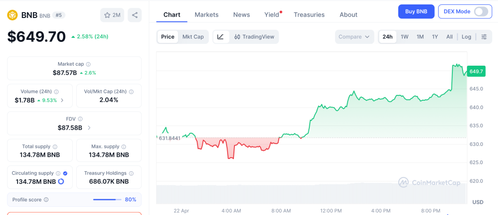 BNB (BNB) trades at $649 per CoinMarketCap after rising 2.58% higher on April 22, posting intraday strength as the latest quarterly auto-burn pulled 2.14 million BNB worth $1.32 billion out of circulation per Cryptonews. Volume sits at $996 million with RSI at 62.5.