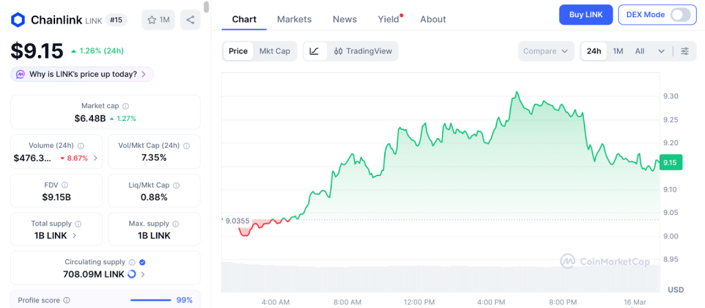 LINK trades at $9.15 according to CoinMarketCap, foundational to DeFi infrastructure but fully priced by the market despite partnerships with major institutions and integration across hundreds of protocols.