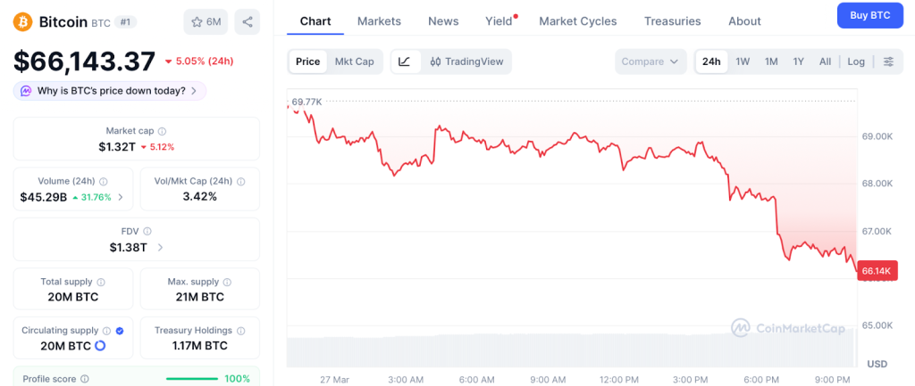 BTC trades at $66,143 per CoinMarketCap, crashing below $67,000 today on the $14 billion options expiry before recovering slightly.