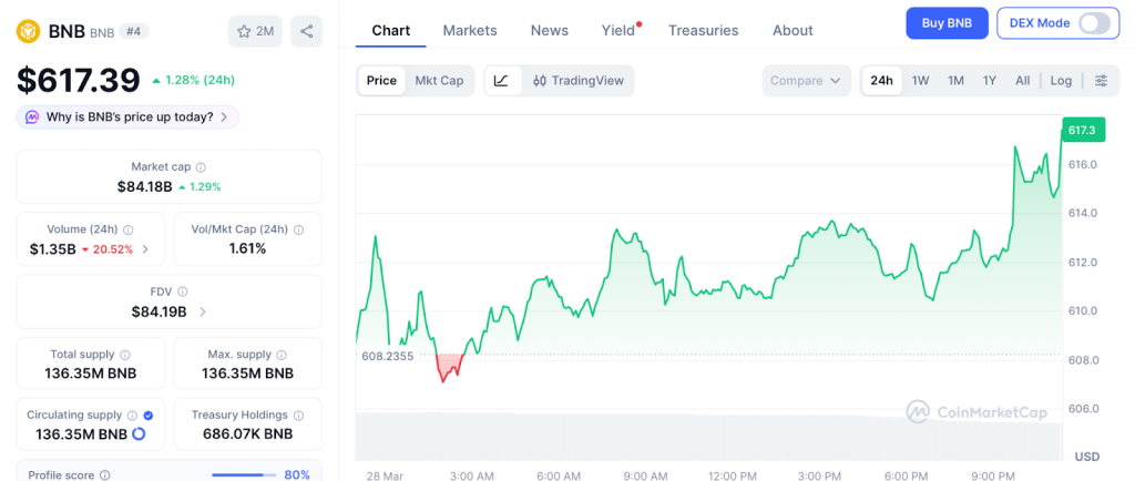 BNB trades at $617 per CoinMarketCap, holding steady as the broader market corrects. At $84 billion market cap, a recovery to $700 delivers 14% over months, a strong ecosystem anchor.