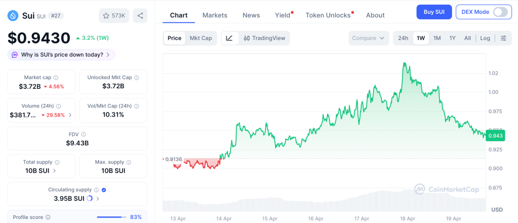 Sui (SUI) trades at $0.94 per CoinMarketCap, pressing against the $1.00 resistance that has capped every rally since mid-March. Support sits at $0.88, and the 200-day SMA at $1.58 shows how far SUI fell from its long-term trend.