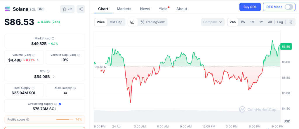 Solana (SOL) trades at $86.53 per CoinMarketCap, up as institutional capital returned through spot ETFs. SOL sits 70% below its $294.87 peak from January 2025, holding $84 as support and $90 as resistance. DEX volume led all blockchains for five straight weeks in Q1 2026.