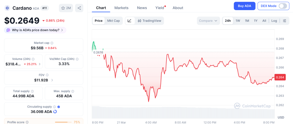 ADA trades at $0.26 on March 21 according to CoinMarketCap. Cardano is forming higher lows on shorter time frames, showing growing buying interest.