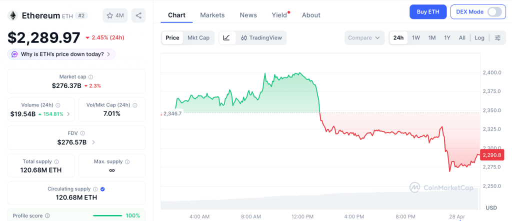 Ethereum (ETH) holds at $2,289 with steady volume as the DeFi sector rebuilds from April’s $606 million in exploits, and Aave alone has raised $160 million toward covering KelpDAO damage on ETH lending pools according to CoinMarketCap