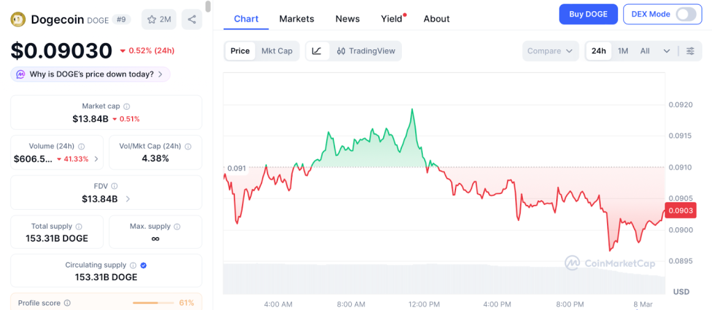 Dogecoin trades near $0.09 according to CoinMarketCap, down more than 80% from its cycle high, and the case for DOGE rests almost entirely on Elon Musk sentiment and meme culture hype.