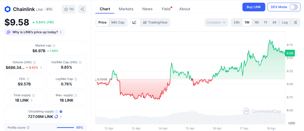 Chainlink (LINK) trades near $9.58 per CoinMarketCap, up 4% on the day and 5.64% on the week. CCIP now processes $18 billion in monthly cross chain volume, and JPMorgan and UBS run live settlement pilots on it.