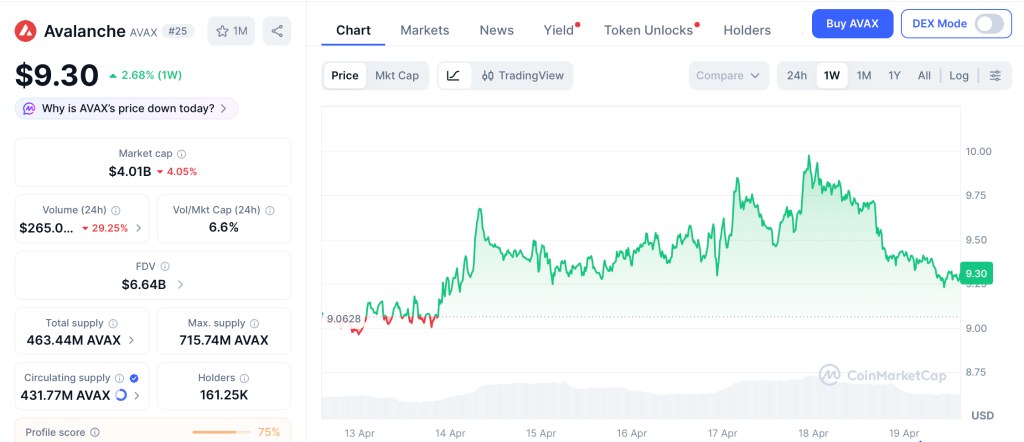 Avalanche (AVAX) trades near $9.30 after ranging between $8.20 and $10.50 through weeks of broader swings according to CoinMarketCap. The subnet model gives it genuine technical depth, and partnerships with Deloitte and Mastercard reinforce that credibility.