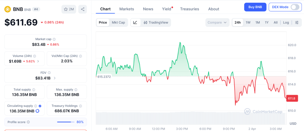According to CoinMarketCap, BNB trades at $611, maintaining stability as the broader market corrects. At an $83 billion market cap.