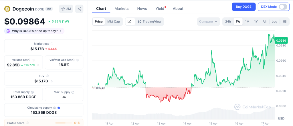 Dogecoin trades near $0.098 on April 17 according to CoinMarketCap, sitting roughly 87% below its all time high of $0.7376 according to CoinMarketCap data. The unlimited supply model means new coins enter circulation every day, diluting demand even when buying pressure returns.