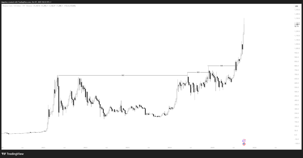 Take a look at the weekly charts for BNB/USD and BTC/USD side by side; they’re almost identical. Both show a long accumulation base followed by a Break of Structure (BOS) and an explosive move to new highs.