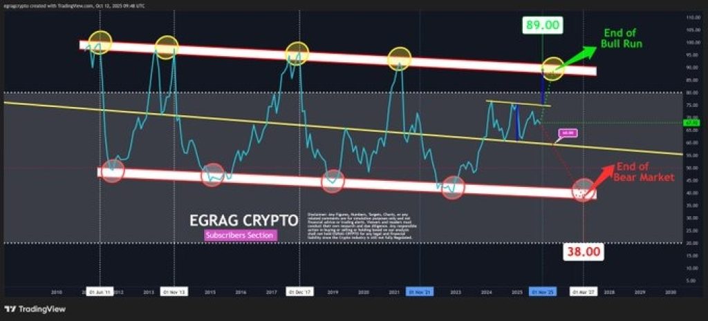 Egrag’s chart tracks Bitcoin’s RSI across multiple cycles going back to 2011. The model highlights a recurring pattern: every time RSI rises toward the upper red band (around 89), Bitcoin reaches its bull market peak. Conversely, every dip to the lower white band (around 38) has marked the end of a bear market.