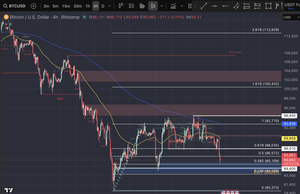 The chart shows multiple failed attempts to reclaim higher resistance, followed by a clean break lower. Moving averages continue to slope downward, reinforcing the pressure. Price action now compresses between support near $85,000 and resistance closer to $88,000, creating a narrow decision zone.