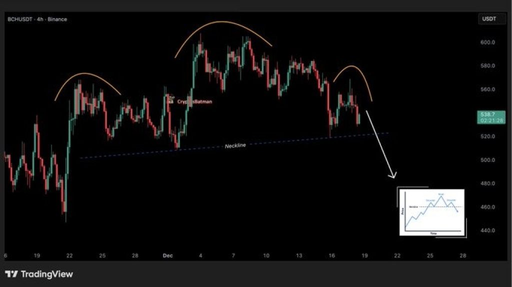 Crypto analyst BATMAN pointed this out on the 4-hour chart, noting that BCH is forming a clean head-and-shoulders structure. It is not a prediction, but it is a warning that upside momentum may be running out.
