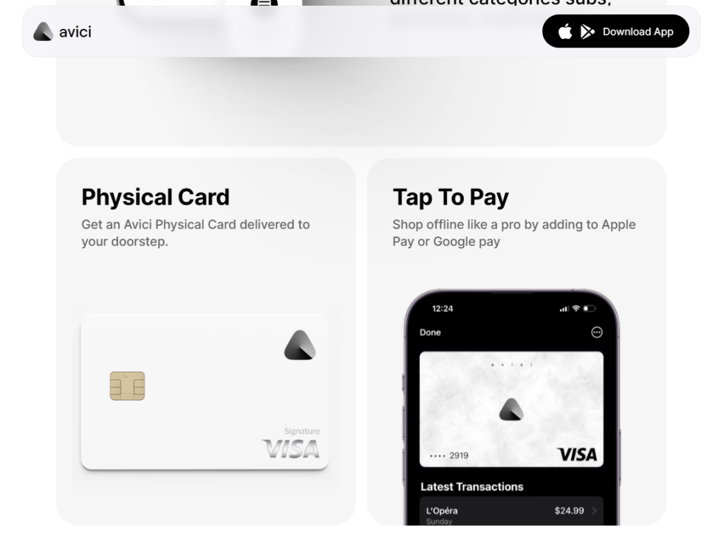 Avici Card offers both virtual and physical Visa cards backed by a crypto-secured credit line, allowing users to spend USDC and other tokens globally without pre-converting to fiat. The card supports Apple Pay/Google Pay, includes Visa Signature perks like lounge access, and is integrated with a DeFi wallet that covers gas fees on supported networks.