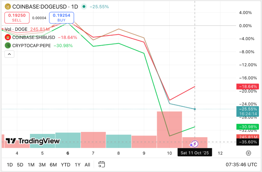 Meme favorites did not escape the slide. PEPE fell 31.94%, Shiba Inu dropped 19.17%, and Dogecoin slid 25.02% in just seven days.