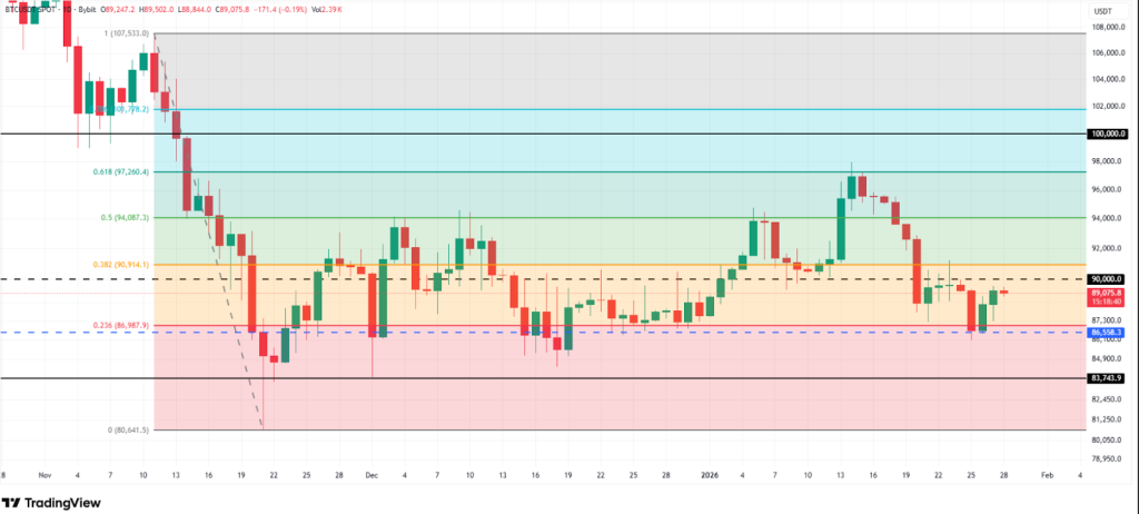 If institutional sentiment improves and long-term holders shift back to accumulation, the Bitcoin price could regain upside momentum. A move above $90,000 would signal renewed strength and attract sidelined capital. The more critical milestone remains $94,087, which aligns with the 50% Fibonacci retracement level.