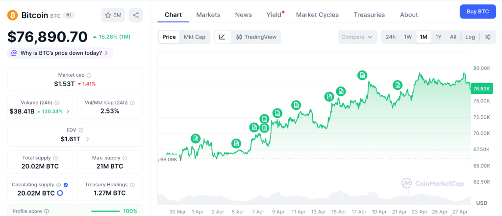 Bitcoin trades at $76,890 as of April 27, up roughly 15% on the month after bouncing from $68,000 at the start of April, per CoinMarketCap.