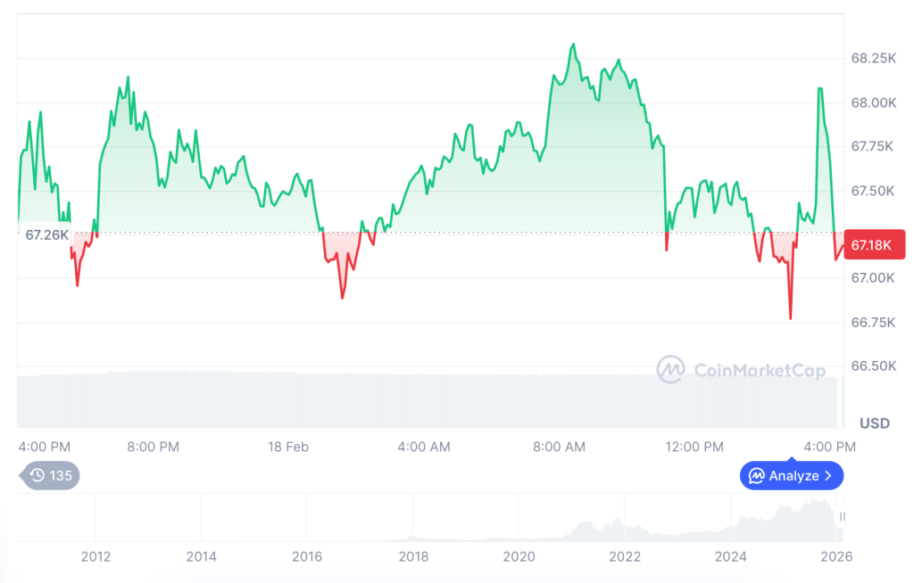 Bitcoin is slightly up, to around $67,340 on 18 February, in a session that largely mirrored the broader market’s modest uptick. There’s no single catalyst driving todayโs Bitcoin price news, likely a combination of technical consolidation after recent pressure, with reduced liquidations easing the selling.