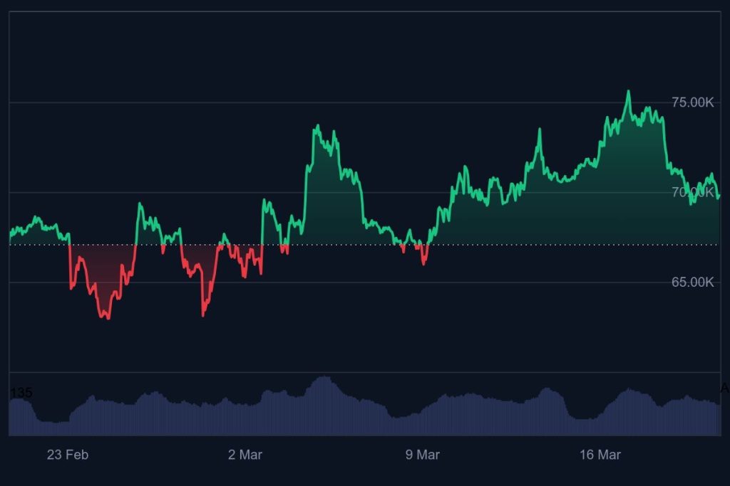 Bitcoin appreciated by 4% over the past month, reaching $69,744 on March 20 after starting at $66,810 on February 23. This increase in Bitcoin’s price keeps it afloat in relation to the $70,000 level.