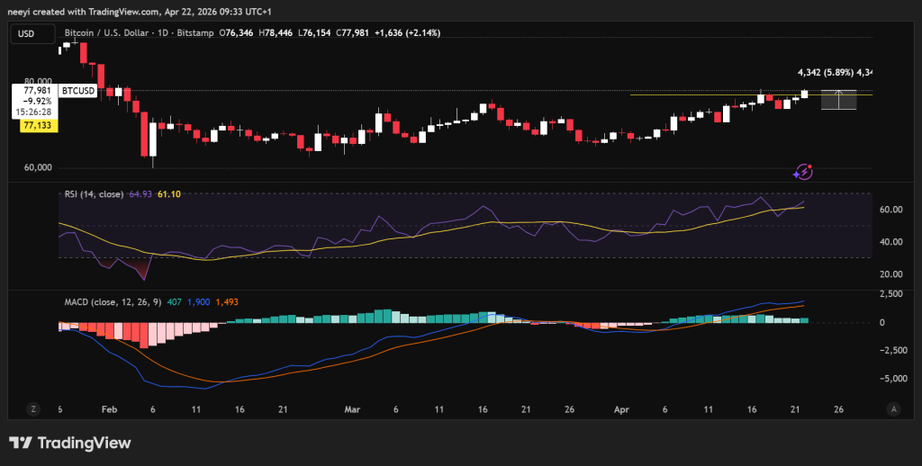 A look at the BTC chart shows immediate support near $77,100 if a pullback occurs. The Relative Strength Index sits at 64, which leaves room for further upside before the market enters overbought conditions.