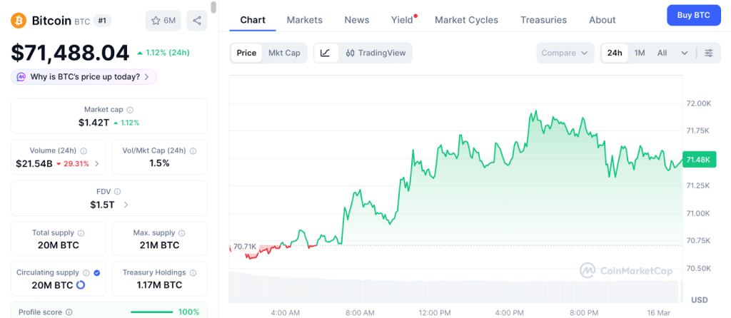 BTC reclaimed $71,488 after touching $74,000 and reversing 3.5% according to CoinMarketCap on fresh Iran escalation. The price sits in a range between $66,000 and $73,000 with $767 million in ETF inflows this month providing structural support.