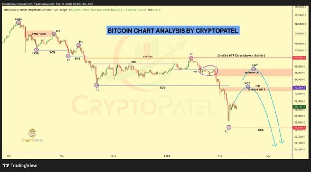 Patel’s chart shows the Bitcoin price trying to stabilize, but the market still looks fragile. The price is stuck between two big zones: recovery toward $80K, or breakdown into a new accumulation range.