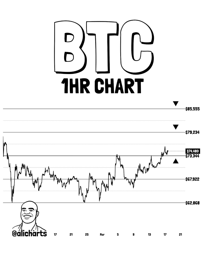 In the near-term, crypto analyst Ali Charts predicts that Bitcoin could rally to $79,234 if Bitcoin manages a daily close above $73,344 on March 18.