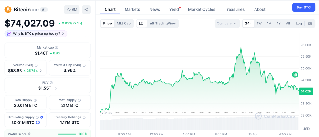 BTC sits at $74,027 as of April 15, up from $65,000 in late March, per CoinMarketCap. Strategy kept buying the dip and holds over 761,000 BTC. Whale wallets stacked throughout the crash while exchange reserves stayed near multi-year lows.