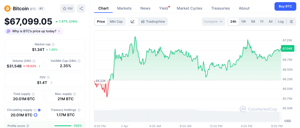 Bitcoin trades at $67,099 after closing Q1 with a 23.8% loss, according to CoinMarketCap. Arizona’s reserve bill adds to a growing list of state level catalysts alongside corporate treasury accumulation that now exceeds 1.1 million BTC.