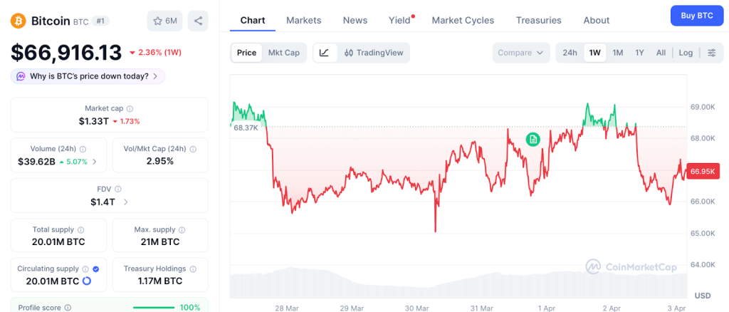 Bitcoin trades near $66,916 as of April 2, per CoinMarketCap. The token fell from a March high near $74,000 and is consolidating around $67,000 support.