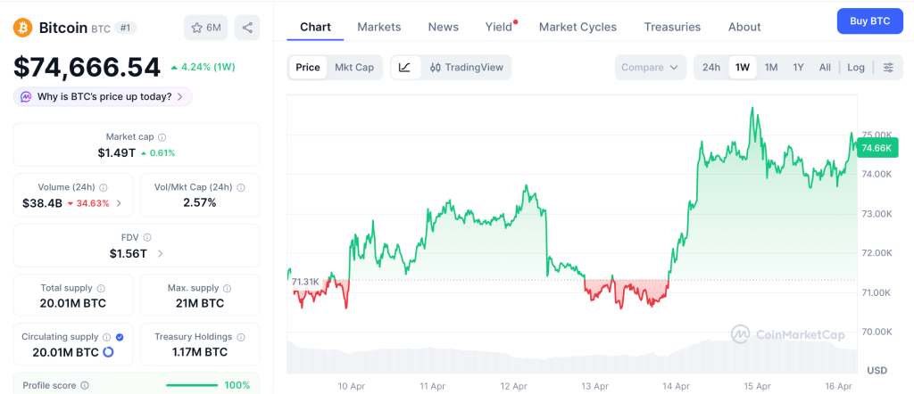 Bitcoin (BTC) trades at $74,666 after briefly printing $76,000 according to CoinMarketCap and reversing at the same ceiling that capped the mid March rally.