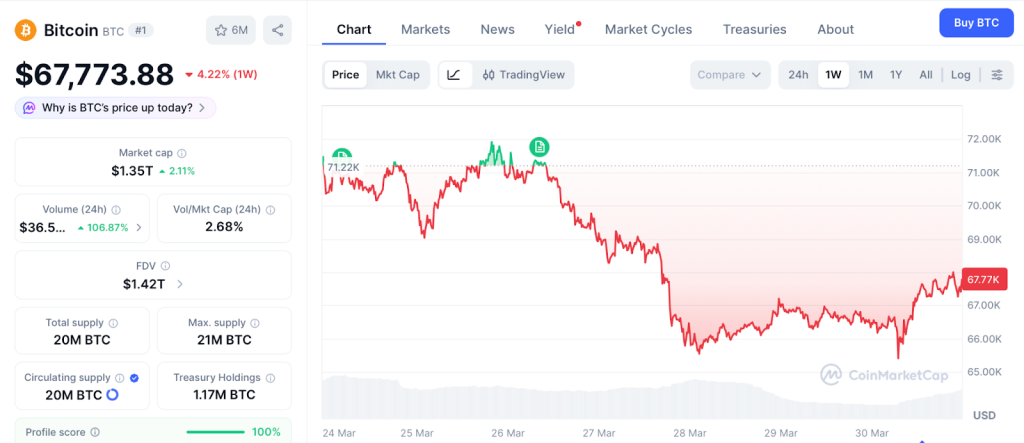 BTC trades at $67,773 on March 30, down 25% year to date and 47% below its $126,000 October 2025 peak according to CoinMarketCap