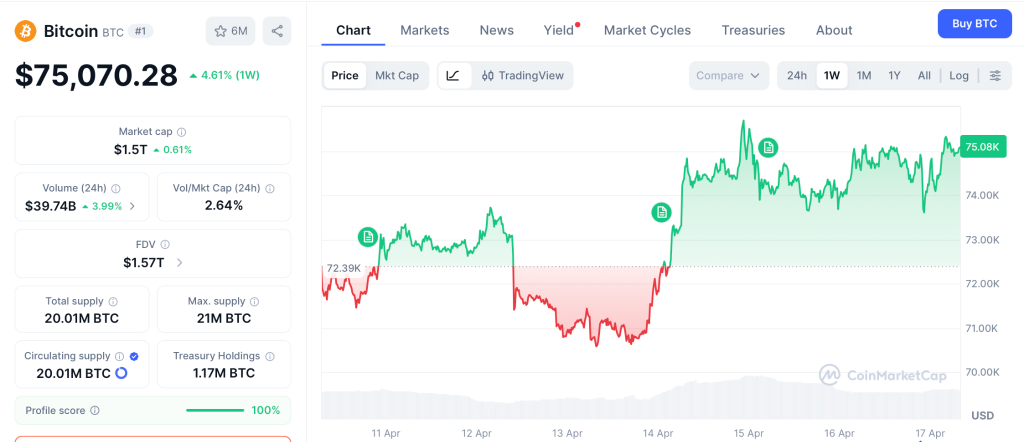 BTC trades near $75,070 after briefly topping $76,000 on April 14 when Iran peace talks lifted risk appetite according to CoinMarketCap.