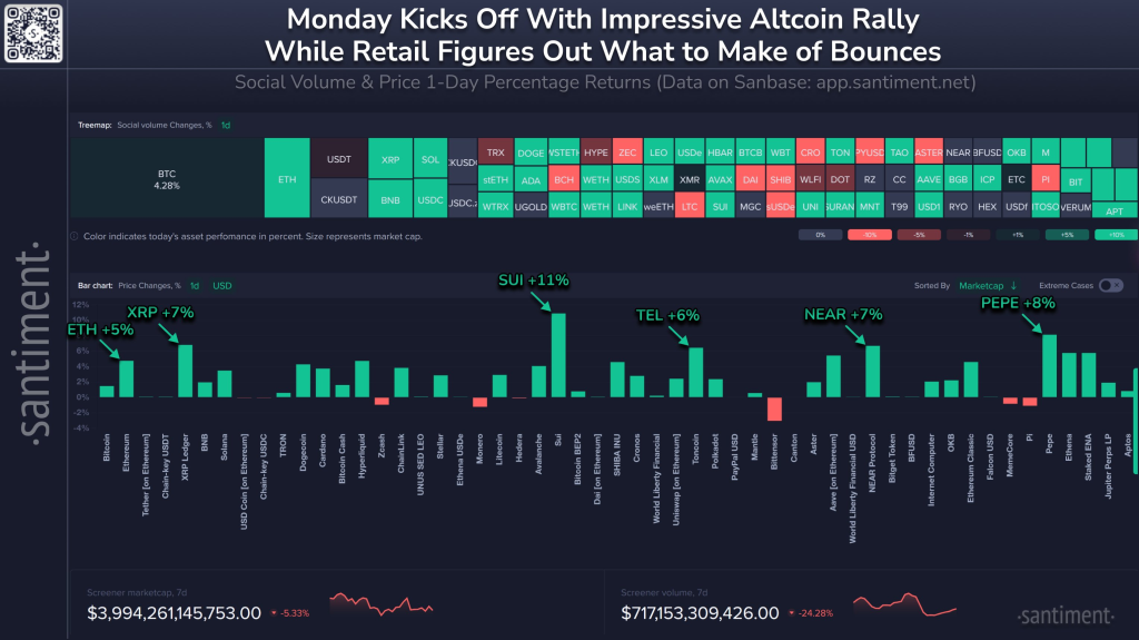 The most notable spikes on the chart come from SUI at +11%, PEPE at +8%, XRP and NEAR both at +7%, along with Ethereum and TEL posting respectable green numbers. The treemap at the top visually reinforces this shift. Many altcoins are highlighted in green, indicating positive social volume and positive price performance, while Bitcoin’s square remains much more muted. That suggests traders spent the weekend recalibrating, shifting from panic into opportunity hunting.