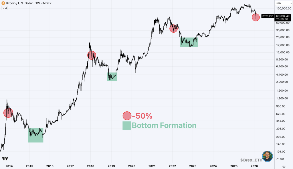 What makes Brett’s chart so important is the pattern it shows across multiple cycles: the -50% drawdown marker is not the finish line. It’s often just the entry point into the real bottom formation zone.