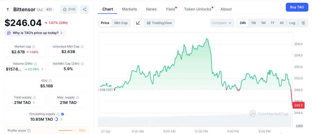 Bittensor (TAO) trades near $246 with a $2.63 billion cap, sitting 67% below its $757.60 all-time high per CoinMarketCap. The token fell 25% in April after Covenant AI exited and accused founder Jacob Steeves of centralized control per CoinRepublic.