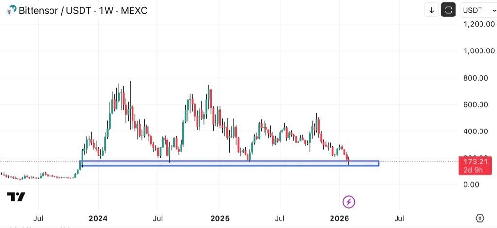 TAO has been sliding lower for months, and the TAO price is now back in the exact kind of area that tends to matter most in a cycle. On the weekly chart, price has dropped straight into a demand band that has held up before, and that’s why this zone is suddenly all anyone is talking about.