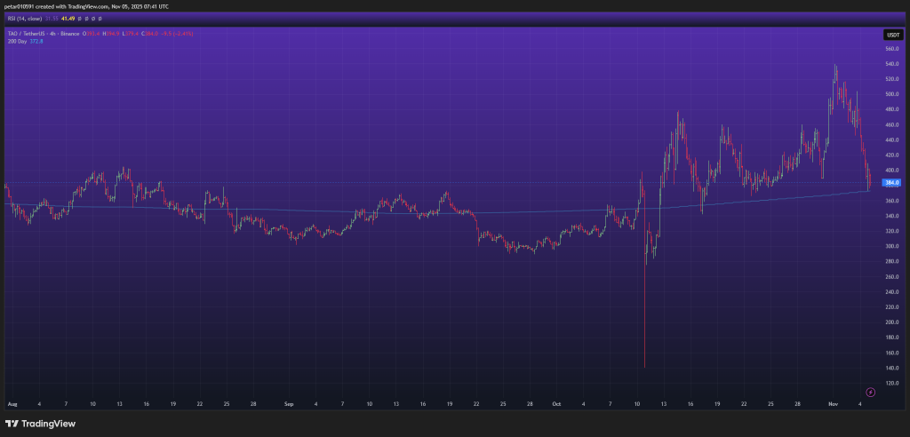The Bittensor (TAO) price is taking a breather after a massive run-up. Just a few days ago, TAO traded near $530, but the price has now dipped toward $380, which means a ~30% correction from recent highs. It’s a familiar pattern across the crypto market; short-term fear, shaky sentiment, and early signs of capital rotating into fresh opportunities that are still early in their growth curve.