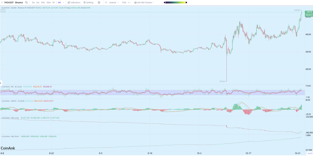 Looking at the current 4-hour chart, it’s clear the TAO price has stretched itself after the run-up. The price is testing heavy resistance around $540 and failing to break above it with conviction. Momentum indicators are also cooling off. The RSI remains elevated (historically a sign that upside energy is fading) while MACD bars show momentum slowing after a strong push. At the same time, net long positions have been declining and net shorts ticked higher, which typically suggests caution entering the market.
