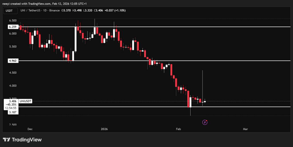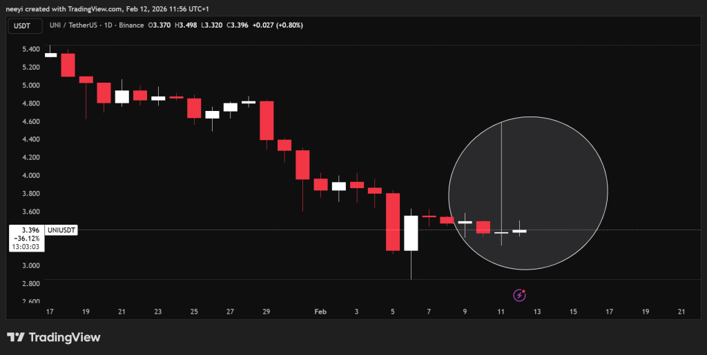 Price action after the spike tells a more cautious story. UNI price has already given back a large part of the rally, even though the decline paused during the latest session.