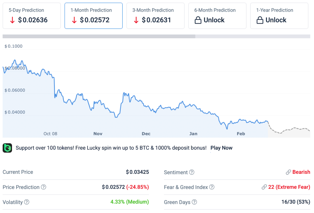 The near-term outlook looks a little tough, with potential downside toward $0.0275 if support breaks, though the 2026 range could see recovery toward $0.096 if broader market conditions improve. That’s above 177% upside from current levels.