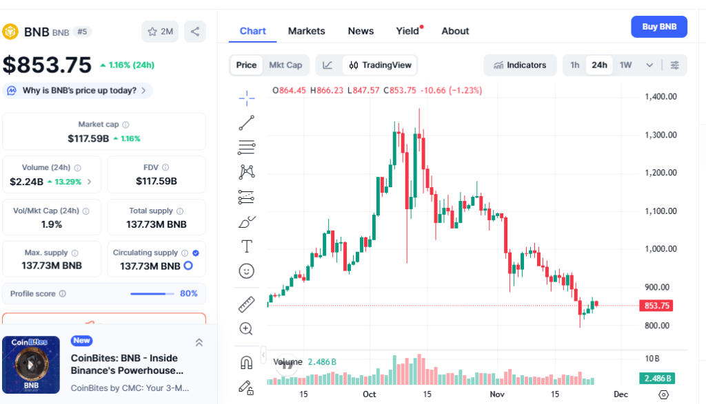 BNB is trading around $853 on Nov 25 and remains one of the most liquid altcoins in the market.