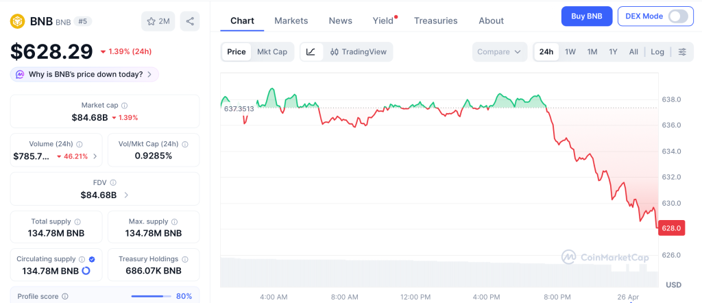 BNB trades at $628 after a flat 24-hour session as the network prepares for its April 28 Osaka/Mendel hard fork according to CoinMarketCap. BNB Chain completed its 35th quarterly burn on April 15, removing 1.57 million BNB worth $1.02 billion from total supply.