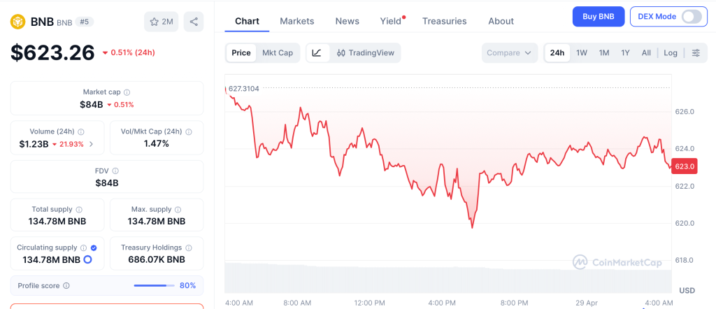 BNB trades around $623 today, holding above the $600 floor that broke twice in March, per CoinMarketCap. Binance Chain TVL crossed $5 billion this quarter, but the chart needs a clean weekly close above $720 to invite serious flow.