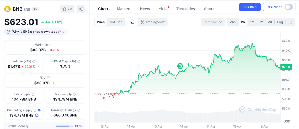 BNB sits at $623 per CoinMarketCap with an $83 billion cap, holding above $610 support. Changelly pegs April between $623 and $685, and Cryptopolitan lifts the 2026 ceiling toward $1,150 if RWA volume keeps stacking.