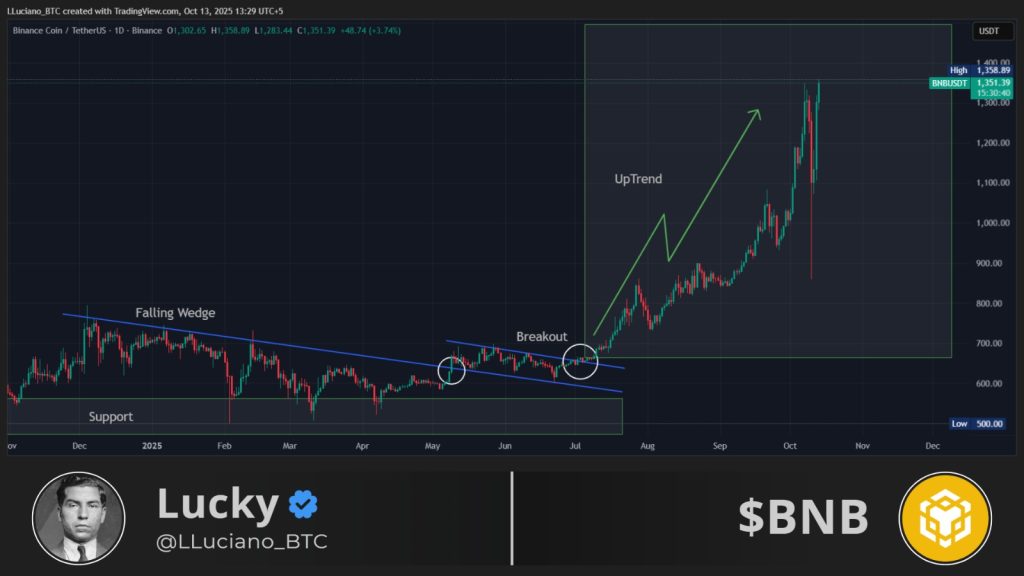 After months of sliding lower inside that wedge, BNB finally broke out, came back for a quick retest, and then launched higher. That retest was key, it showed that buyers were ready to defend the breakout zone, which sits around the $1,200-$1,250 range.
