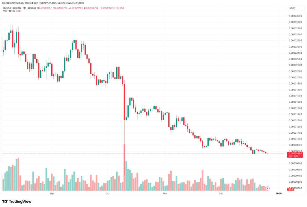 Bonk has declined by 2% on the weekly chart as of December 25th, underperforming a market that has seen a slight uptick. This price action suggests that capital is rotating out of speculative meme coins and into safer assets. The Bonk meme coin outlook is currently clouded by bearish sentiment, with the Fear & Greed Index sitting at 23.