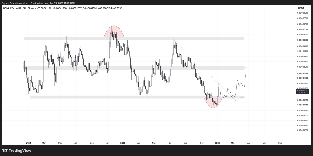 BONK price prediction in this context becomes more about reaction than projection. Crypto_Scient notes that a retest and hold of this support would confirm the reclaim and strengthen the case for continuation. Failure to hold it would invalidate the structure and signal caution.