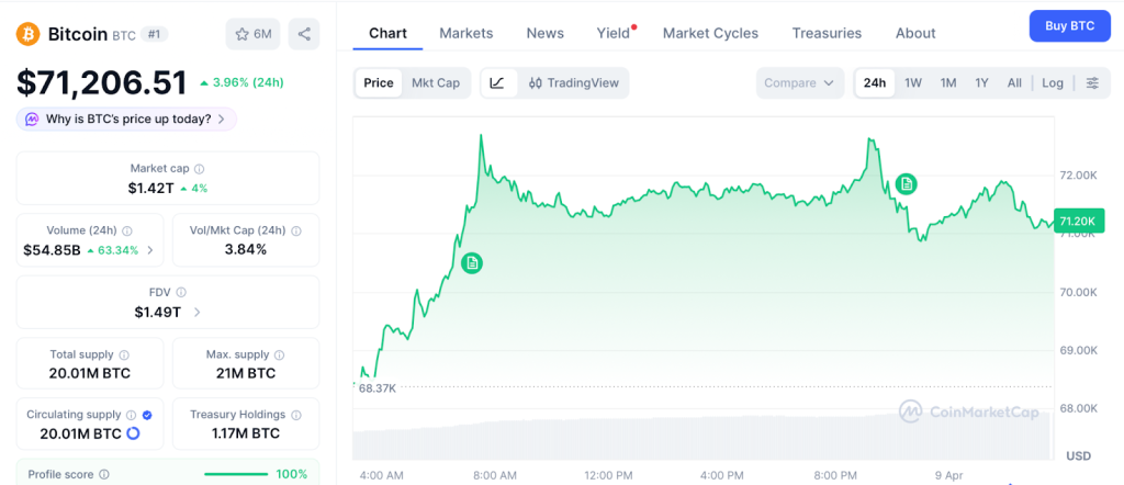BTC surged past $71,206 according to CoinMarketCap with analysts forecasting $85,000 as the next target following renewed institutional interest and ceasefire optimism.