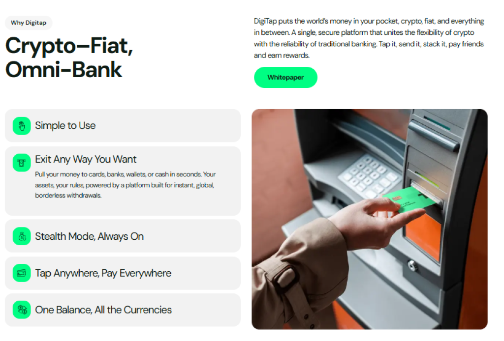 Digitap positions itself as the world’s first omni-bank. A financial platform where fiat, stablecoins, and crypto operate under a single roof. The interface looks and feels like a neobank, but the infrastructure runs on blockchain rails.